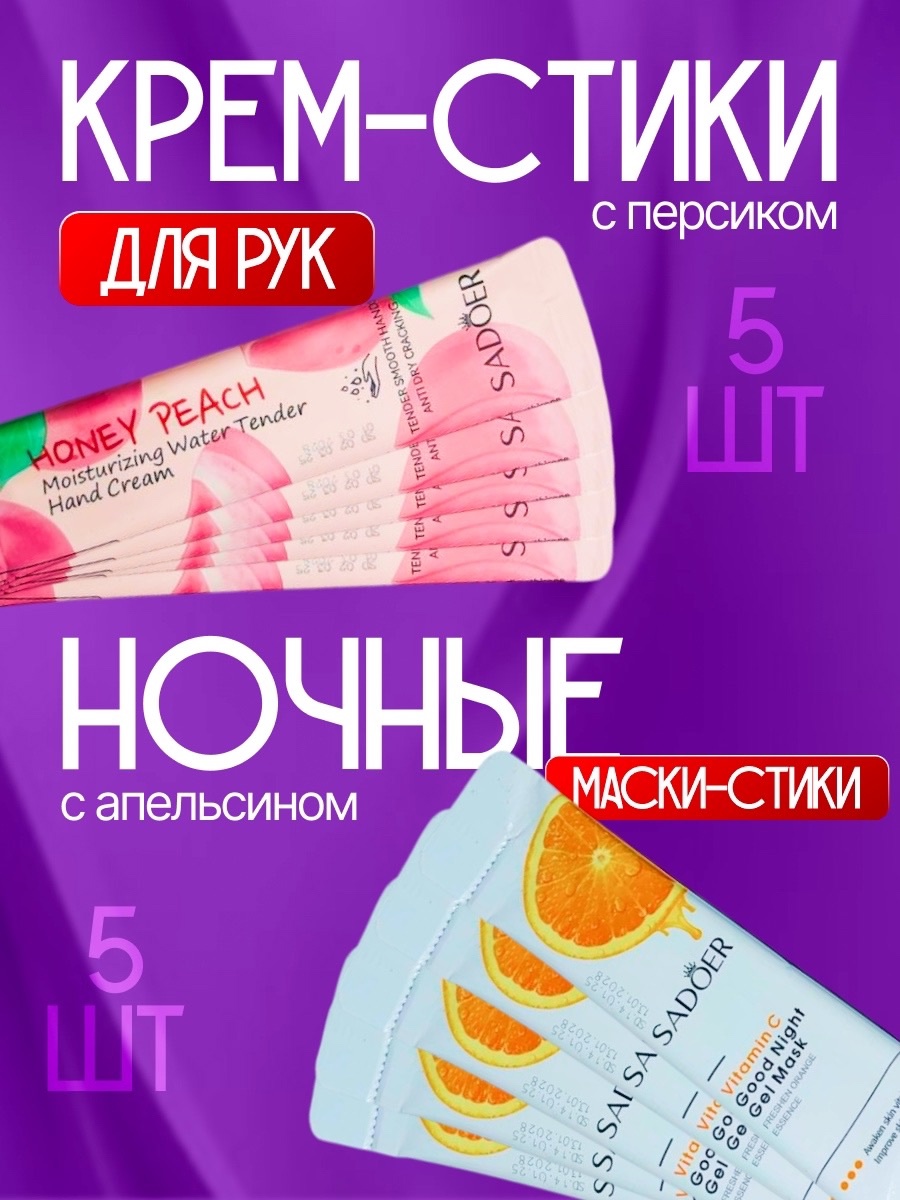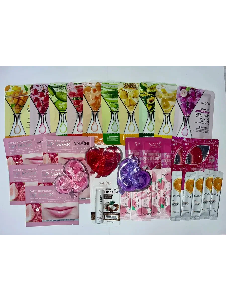 Набор Beauty box в красивой подарочной коробке с бантиком включает 40 предметов: тканевые маски для лица разные фрукты и овощи SADOER алоэ, вишня, ананас, авакадо, арбуз, манго, дыня, виноград, огурец, банан по 1 шт (всего 10 шт), патчи для глаз с гранатом SADOER (5 шт), патчи для губ клубника SADOER (5 шт), крема-стики для рук персик SADOER (5 шт), ночные маски-стики апельсин SADOER (5шт), бальзам для губ кокос SADOER (1шт), мыльные розы 3 набора по 3 шт красные,розовые, фиолетовые (9 шт).