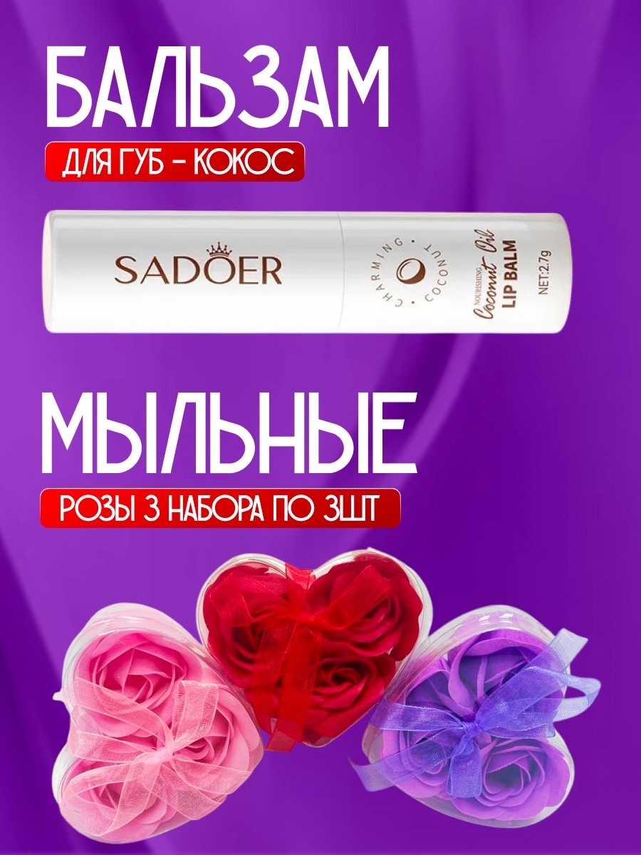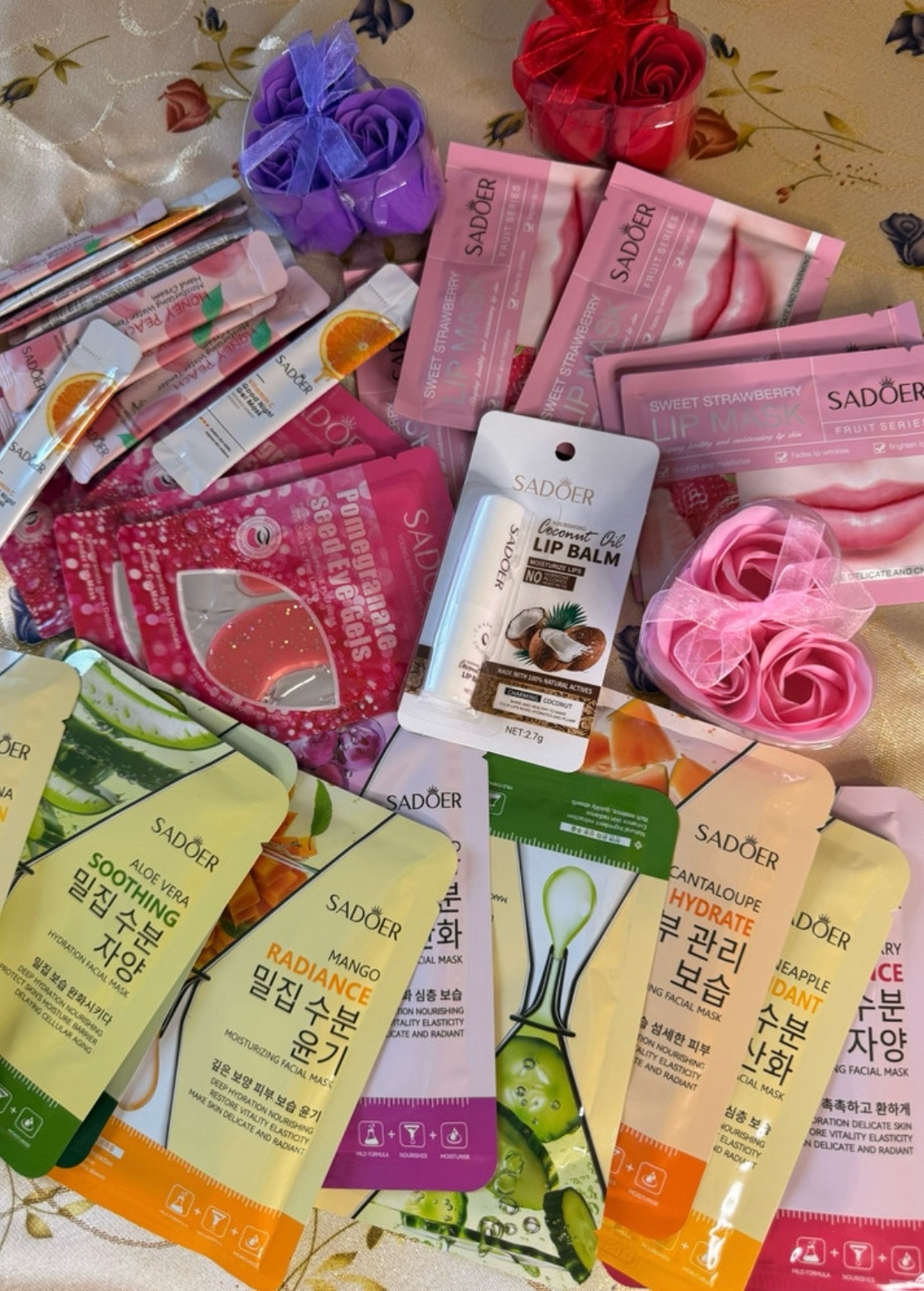 Набор Beauty box в красивой подарочной коробке с бантиком включает 40 предметов: тканевые маски для лица разные фрукты и овощи SADOER алоэ, вишня, ананас, авакадо, арбуз, манго, дыня, виноград, огурец, банан по 1 шт (всего 10 шт), патчи для глаз с гранатом SADOER (5 шт), патчи для губ клубника SADOER (5 шт), крема-стики для рук персик SADOER (5 шт), ночные маски-стики апельсин SADOER (5шт), бальзам для губ кокос SADOER (1шт), мыльные розы 3 набора по 3 шт красные,розовые, фиолетовые (9 шт).